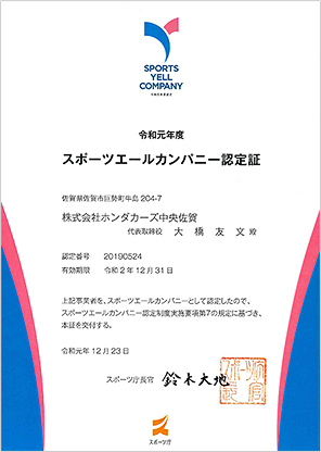スポーツエールカンパニーとは、スポーツ庁が認定する「働き盛り世代」のスポーツの実施を促進し、社員の健康増進のためにスポーツの実施に向けた積極的な取組を行っている企業です。佐賀県では当社が初めて認定されました。会社として、社内の部活動の支援を行い、スポーツを通して社員の健康増進を積極的にバックアップしています。