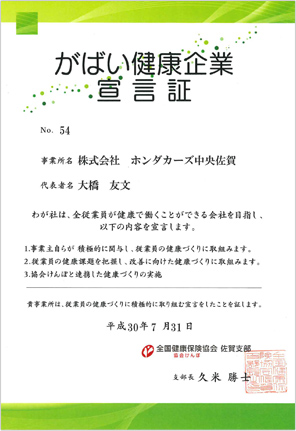 がばい健康企業宣言とは、社員の健康を重要な健康資源と捉え、健康増進に積極的に取り組み経営スタイル(健康経営R)を実践することです。特に優れた取り組みを行っている企業を協会けんぽ佐賀支部様が認定しています。
