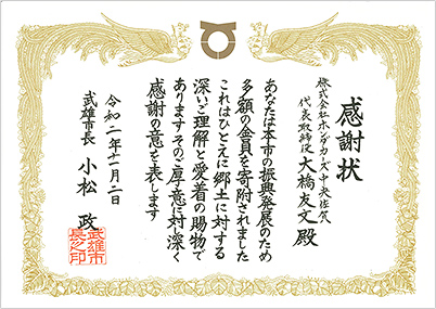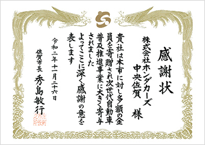 2020年11月、佐賀市と武雄市に20万円を寄付しました。私募債発行額の一部をSDGsに取り組む自治体などに寄付を行う佐賀銀行の『さぎんSDGs私募債』を 活用したものです。当社社長の大橋が佐賀市長および武雄市長に目録を手渡し、感謝状を受け取りました。寄付金は、交通安全活動やエコカーを推進する事業などに活用されます。