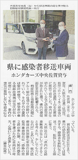 2020年5月、当社は、新型コロナウイルス感染者の移送車両1台を佐賀県に無償で貸与しました。車内が仕切られているなど感染症対策が施された車で、県内の保健福祉事務所に配備されています。