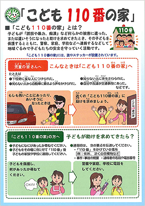 全拠点『こども110番の家』に登録して地域のこどもたちの保護活動を行い、警察や学校などと連携することにより地域ぐるみでこどもたちの安全を守る活動を積極的に行います。